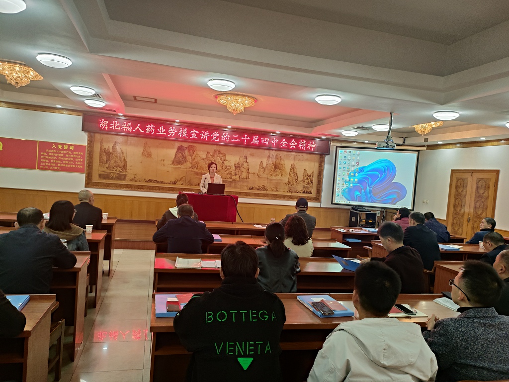 11月7日下午二时许,在福人大会议室里,一场关于使命与担当的宣讲正在热烈进行。“湖北省劳动模范”“荆楚工匠”获得者吴和鸣,以一名深耕医药领域28年的“老药人”身份,向全体职工宣讲党的二十届四中全会精神,将“保障人民健康”的宏大命题转化为医药人“守好一粒药”的生动实践。
